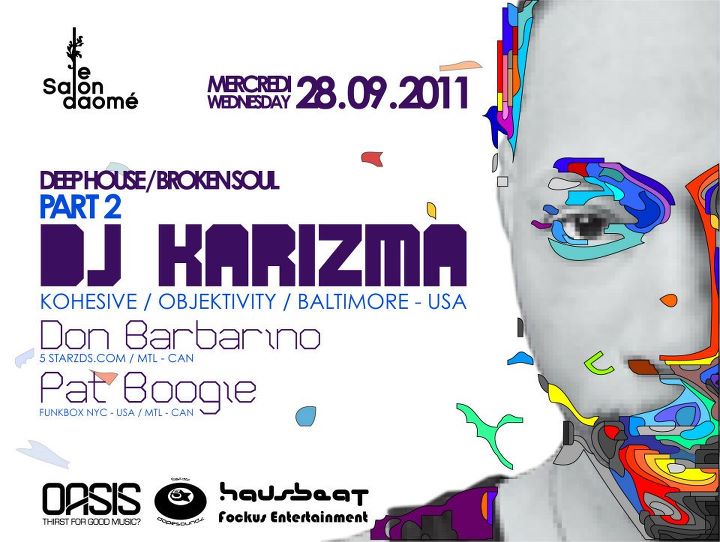For this special occasion we are welcoming back on the turntables DJ KARIZMA (Kohesive – Objektivity – Baltimore US) alongside Oasis residents Pat Boogie (Funkbox NYC – USA / Montreal – Canada) & Don Barbarino (5Starz Dope Soundz / Montreal – Canada)