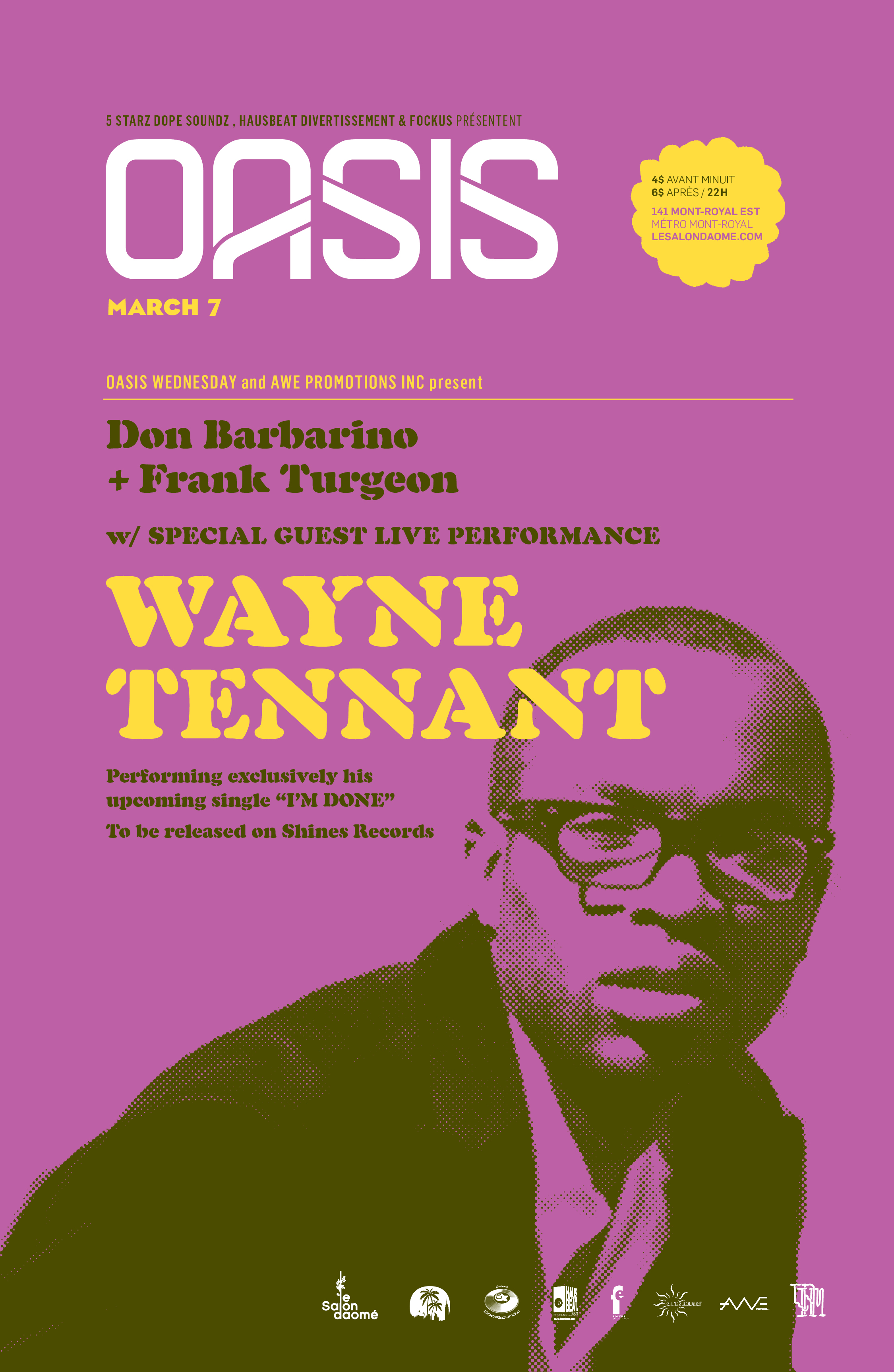 The Oasis Crew is happy to have the very talented Wayne Tennant @ Salon Daomé for an exclusive live performance which will include his latest single ‘I’m Done’ to be released March 30th on Shines Records.