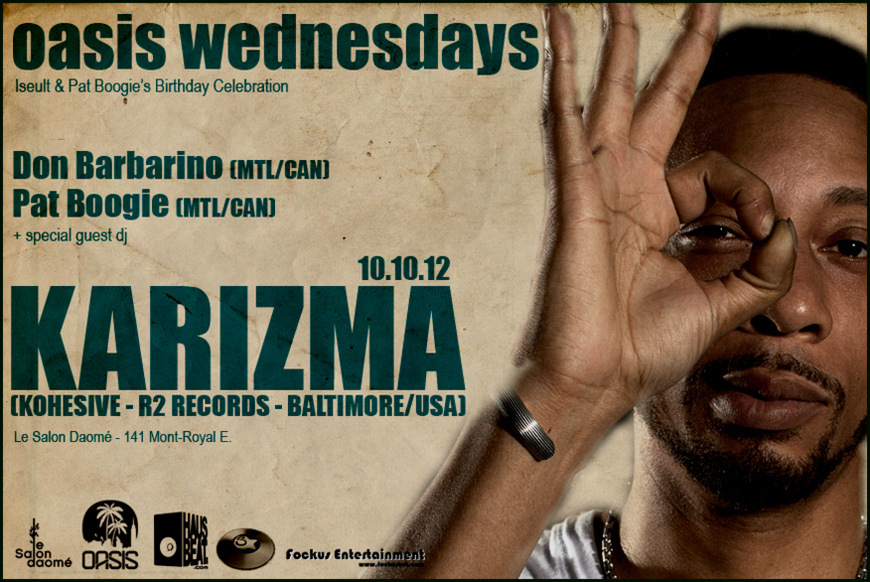 On Wednesday, October 10th 2012 we are celebrating the birthday of two members of the Oasis Crew, Miss Iseult aka Izy and Da Boogie Man Pat Boogie. For this occasion we have a very special guest all the way from Baltimore who will grace us on the 1s & 2s, the one and only KARIZMA playing alongside Oasis resident Dj, Don Barbarino and the Bday Boy, Pat Boogie.