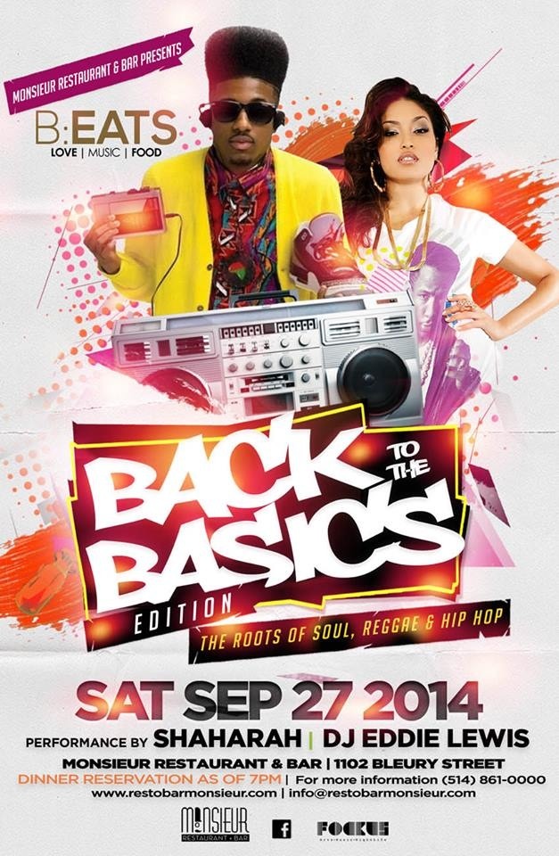 Taking it Back to the Basics for our September edition of B:EATS @ MONSiEUR Resto/Bar interpreted by Shaharah accompanied by Paul Lizzi & Ralph Telemaque with Eddie Lewis on the 1s & 2s.