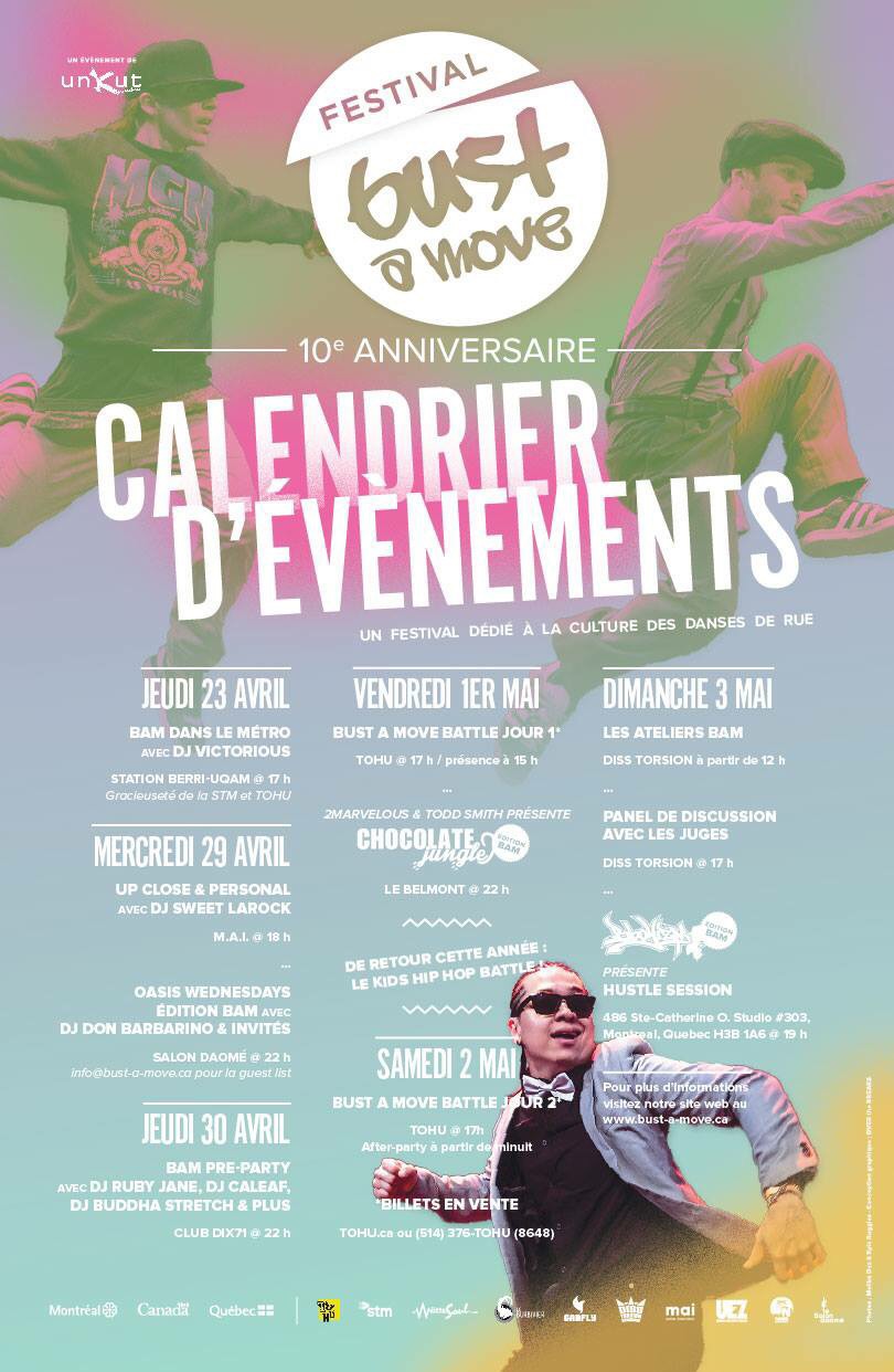 “Bust A Move Festival is mandated to celebrate the diversity of street dance culture. We provide a platform for street dancers to express and expand their art, in addition to granting audiences with a window onto the raw essence of this fascinating art form.” – www.bust-a-move.ca