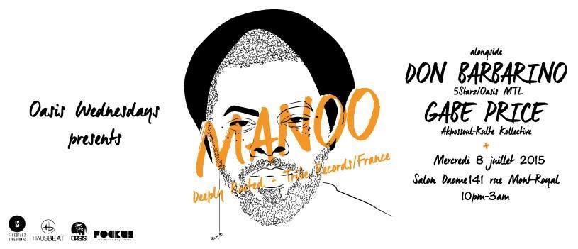 The Oasis Crew is proud to welcome to its famous night DJ/Producer Extraordinaire Manoo ((Deeply Rooted/Tribe Records France) who will be playing alongside Gabe Price (Akpossoul-Kulte Kolledtive) & Don Barbarino (5 Starz/Oasis Mtl).