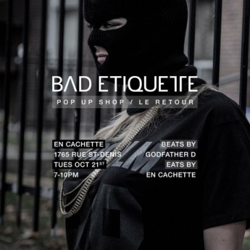 BAD ETIQUETTE – Pop Up Shop / Le Retour Tuesday October 21st 2014 7-10pm En Cachette – 1765 St-Denis, Montreal Beats by: Godfather D Eats by: En Cachette Food x Liquor x Dope Beats FACEBOOK EVENT PAGE Montreal!!! It’s time to get your shopping on as we bring our Bad Etiquette Sophomore Capsule Collection to … More Events: BAD ETIQUETTE – Pop Up Shop / Le Retour