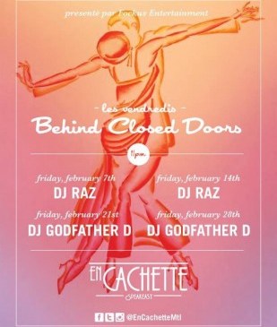 B E H i N D C L O S E D D O O R S Friday February 28th 2014 En Cachette – 1765 St-Denis, Montreal Music by: Godfather D Entrance: Free http://www.facebook.com/fockusentertainment Join En Cachette Facebook Page here! Godfather D will be behind the turntables this Friday, keepin’ ya head bobbing all night … More Events: Behind Closed Doors @ En Cachette w/ Godfather D