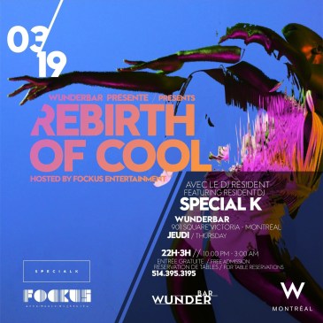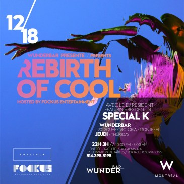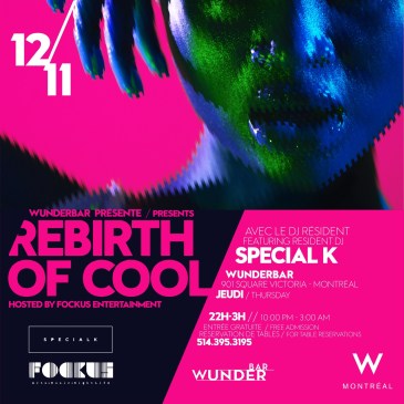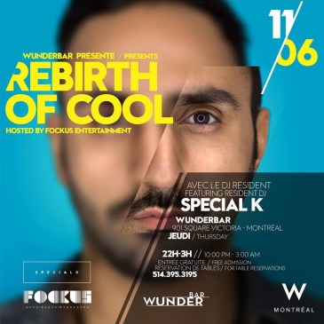 Rebirth of Cool Thursday April 9th 2015 Wunderbar (W Hotel) – 901 SQ Victoria, Montreal Music by: Special K Hosted by: Fockus Entertainment Entrance: Free Hip Hop R&B Reggae Join the Wunderbar Facebook page HERE! A touch of old school classics mixed with brand new hits in the chic ambiance of Wunderbar (W Hotel) with … More Events: Rebirth of Cool @ Wunderbar (W Hotel) ft Special K